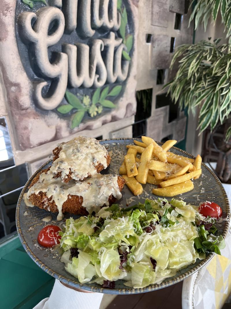 El yapımı tavuk şinitzel, mevsim salatası, patates cips. grana padano parmesan, kremalı mantarlı sos.