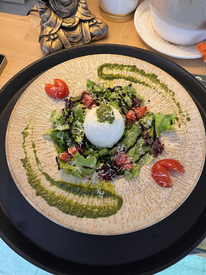 Chef’in özel salata sosu ile harmanlanmış mevsim yeşillikleri üzeri el yapımı burrata peyniri, pesto sos, baby corn, çeri domates.