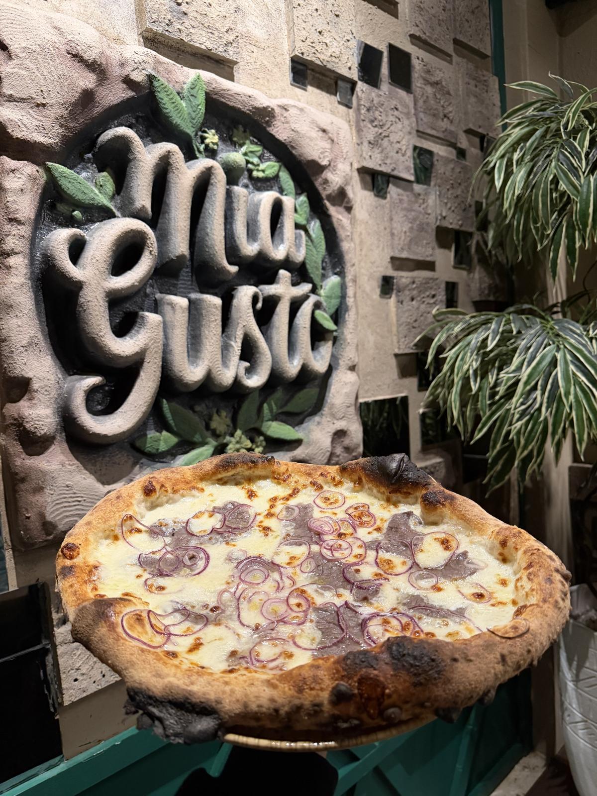 Ekşi maya hamur, isli trüflü white sos, mozeralla, 72 saat özel teknikler ile marine edilmiş biftek eti.Mor soğan grana padano parmesan, sızma zeytinyağı.